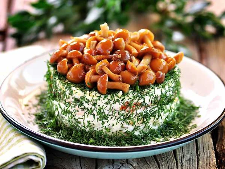 Слоёный салат «Грибная поляна» с курицей: рецепт