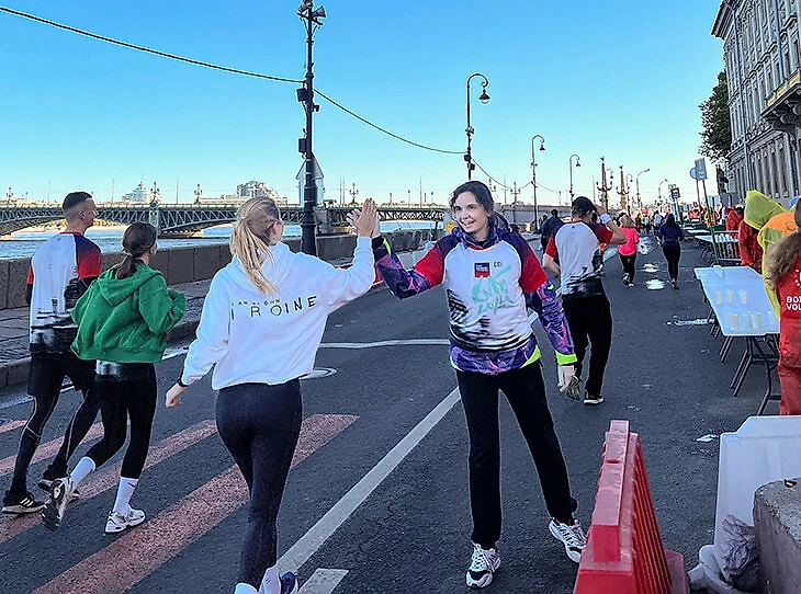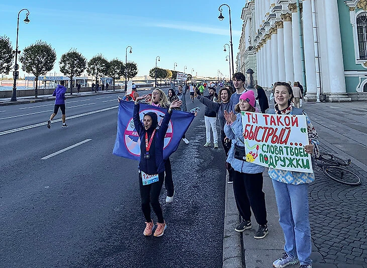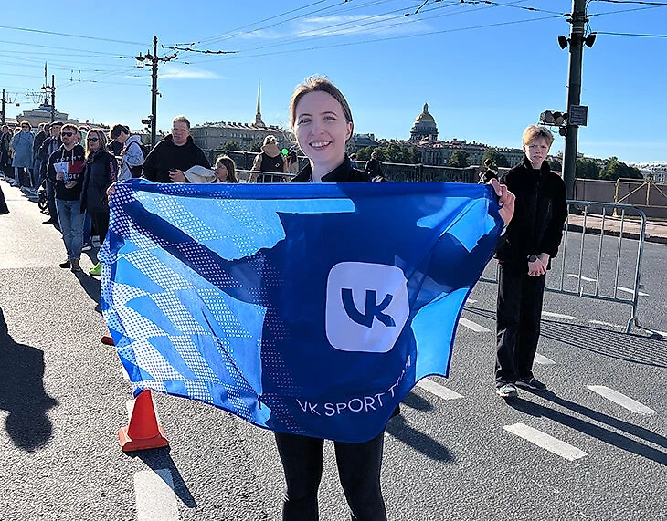 Иду дальше, Дворцовый мост гудит – весь в болельщиках. Судья на самокате просит отойти за конусы, бежать уже очень тесно. Встречаю Марию с флагом VK Running Club. В корпоративном клубе в Петербурге состоят около 30 сотрудников VK, у них есть тренер – Денис Васильев, чемпион России в эстафете 4×1500 м, трехкратный победитель пробега «Пушкин – Санкт-Петербург» на дистанции 30 км. Мария уже пробежала десятку и пришла поддержать одноклубников.