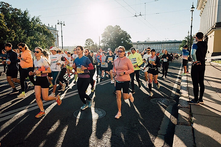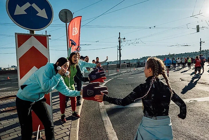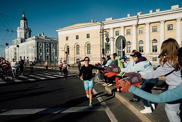 Выдвигаюсь к следующему беговому клубу – Piranha. Иду по Дворцовой набережной, а рядом бегут любители. Стараюсь их подбадривать как могу, но получается не так хорошо, как у девушки-волонтера, которая успевает читать имена на стартовых номерах: «Как она бежит! Татьяна! Вы все богини и боги! Бежите завоевывать первые места!» Атлеты улыбаются, кто-то и правда начинает ускоряться.