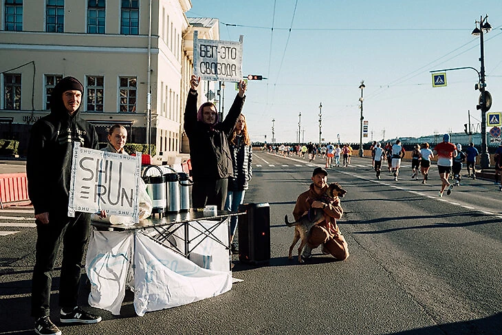 11 утра. Иду к клубам, чьи точки поддержки находятся на Университетской набережной, между 9-м и 10-м км на дистанции. Но только я сворачиваю туда, как проезжает замыкающая машина. Все любители уже пробежали маршрут. Клуб SHU RUN еще на месте, разговор клеится с самого начала. Ребята хвалят мою – то есть свою – куртку. Дело в том, что клуб создан на базе бренда SHU. Сначала они выпускали повседневную одежду, год назад запустили беговую линейку, а в мае открыли в Питере контейнер, где можно переодеться, оставить вещи, попить кофе и присоединиться к тренировкам от бренда.