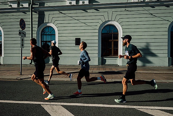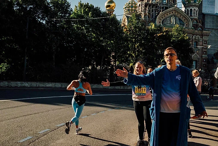 Уже 10 утра, скоро должен прибежать лидер. Возвращаюсь на Дворцовую набережную, по пути разговариваю с другими болельщиками. Юрий из Москвы бегает один, так как нет времени на клуб. Его друг Максим занимается в беговой школе I Love Running два раза в неделю и наоборот считает, что тренироваться в компании проще: «Это мотивация, ты договариваешься с кем-то, а когда ты один, то постоянные отговорки: устал, не хочу, не могу». Что, если для каждого есть подходящая беговая тусовка с единомышленниками, просто найти ее иногда удается лишь через несколько лет?