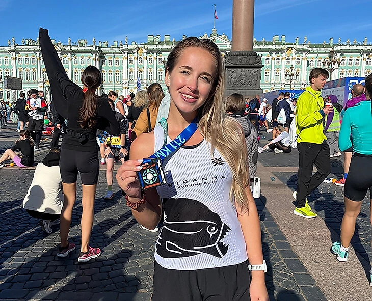 Для результата нужно тренироваться регулярно и циклами, сам себе ты не будешь ставить сложные тренировки, а тренер будет. Для прогресса, поддержки и мотивации я и состою в клубе. Это известный беговой клуб, популярные тренеры; есть прикольный мерч, что тоже немаловажно. У меня сумка, шапки, перчатки – все «Пираньи». Мне нравится их идеология – быстрые, классные, красивые».