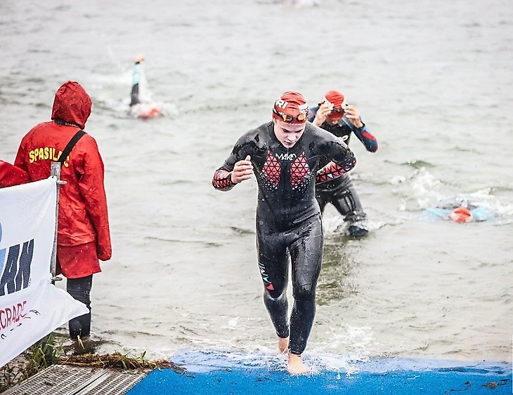 Приближалось время старта, я, надев плавательный гидрокостюм, отправился к тому месту, где должен был начаться плавательный этап. Все это время шел дождь, и он не слабел, а только усиливался. Некоторые шутили, что лучше после плавания прямо в гидрокостюме садиться на велик, тогда будет тепло. Оставалось еще несколько минут до старта, и я решил войти в воду. На удивление вола была теплой. Чувствовал себя как в джакузи, но пришло время из него выходить. Я не самый сильный пловец, а потому встал группу, которая стартовала 3 из 4. Прыгнул воду и все... Началось. Все шло хорошо. Не было никакой давки не в начале, не на повороте. Вода была такой же чистой, как и в тот день, когда я в ней плавал перед гонкой.
