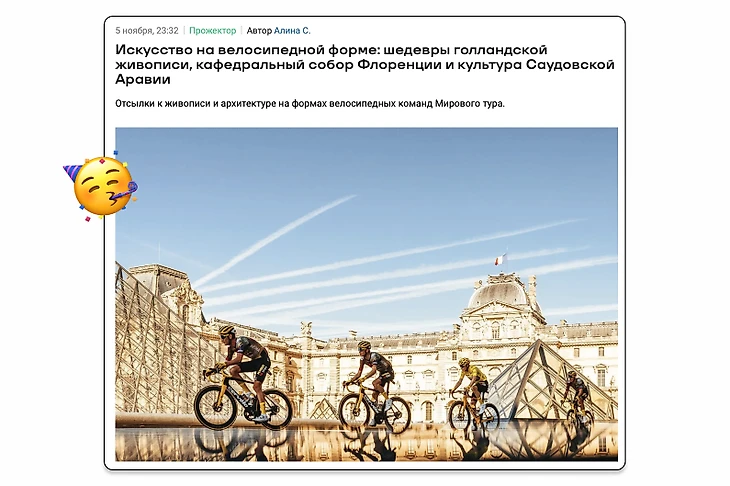 Общим голосованием мы выбрали победителя. Автор этого текста талантливо объединила спорт и искусство. Поводом стали картины Мондриана, Ван Гога, Рембрандта и Вермеера, собор Санта-Мария-дель-Фьоре во Флоренции и культурное наследие региона Аль-Ула, отсылки к которым в разные годы появлялись на велосипедной форме команд Мирового тура.