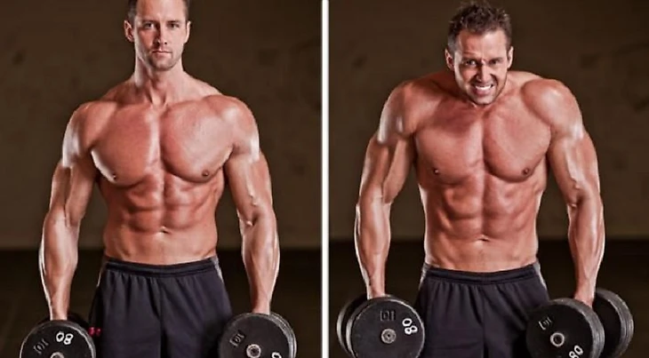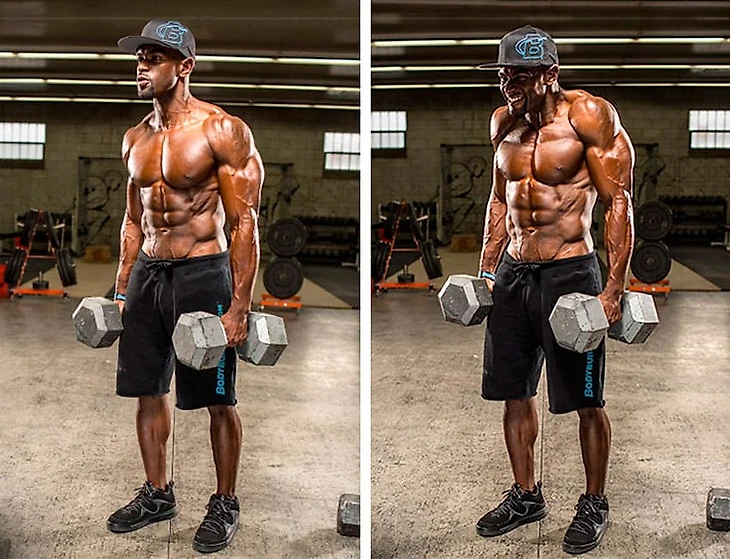 Гантели удерживаются в опущенных руках, ладони слегка развернуты к бедрам. Для обеспечения правильной биомеханики движения гантели следует расположить немного впереди линии бедер.