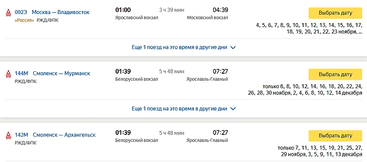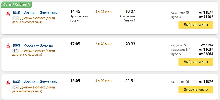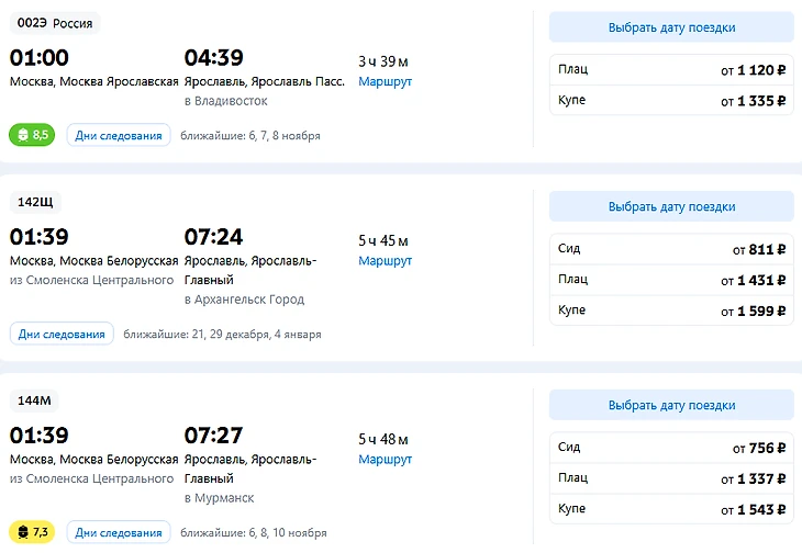 Первый поезд из Москвы отправляется в 00:35, последний – в 23:20. В Ярославле поезда прибывают на станции Ярославль-Главный или Ярославль-Московский. Стоимость билетов начинается от 756 рублей и варьируется в зависимости от типа вагона (плацкарт, купе, СВ), категории поезда (скорый, фирменный) и даты поездки.