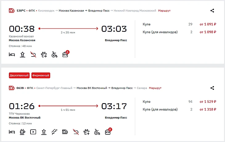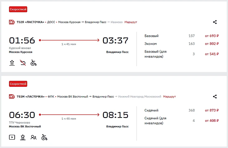 Электрички во Владимир отправляются с Курского и Восточного вокзалов Москвы. Время в пути зависит от типа электрички. На поезде «Ласточка» вы доберетесь до Владимира примерно за 1 час 40 минут, а обычные электрички идут чуть больше двух часов. Стоимость билетов на «Ласточку» начинается от 761 рублей, а на обычные электрички – около 689 рублей. Вы можете выбрать удобное расписание, так как поезда отправляются несколько раз в день.