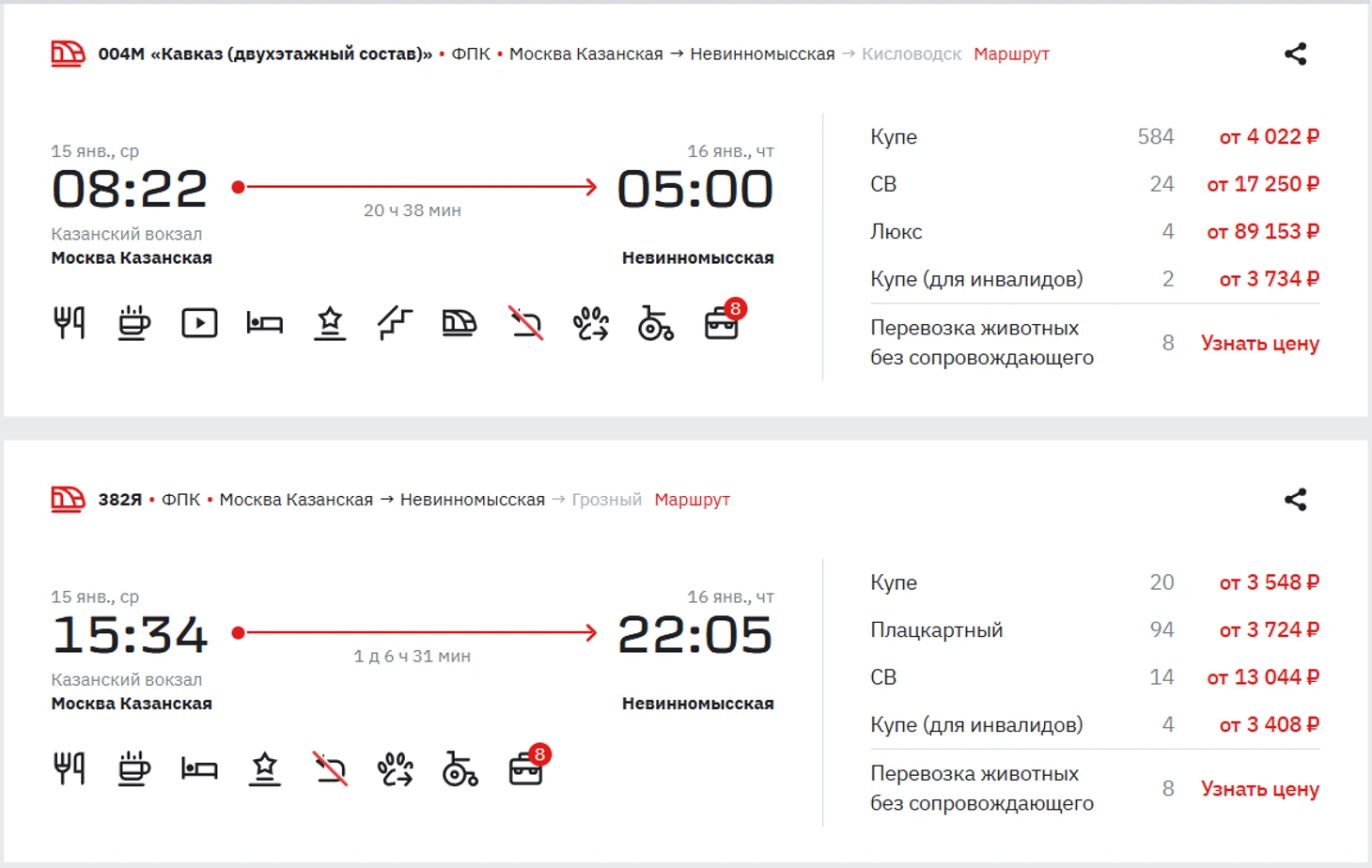 Поездка на «Кавказе» займет примерно 20–22 часа, а на обычных пассажирских поездах — около 1,5 суток. Стоимость билетов зависит от класса, начиная примерно от 3000 рублей за плацкартный билет и от 4500 рублей за купе.