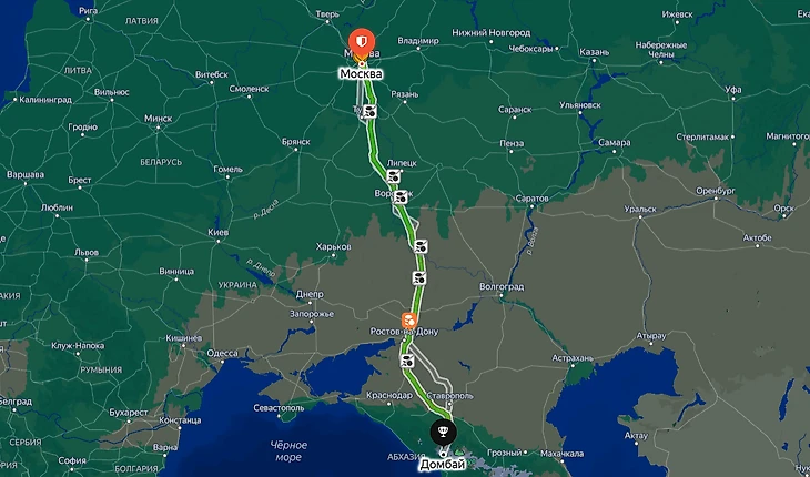 Многие предпочитают добираться до Домбая из Москвы на автомобиле. Это и удобно, и относительно быстро, и в дороге можно весело провести время, если вы едете дружной компанией. Кратчайший маршрут проходит по трассе М4 «Дон», через Воронеж и Ростов-на-Дону, затем – по трассе А155, которая ведет к горнолыжному курорту. Весь путь составляет примерно 1620 км и может занять от 18 до 20 часов без учета длительных остановок, но реальное время в пути зависит от количества перерывов на отдых и питания. На трассе М4 «Дон» есть как платные, так и бесплатные участки, что позволяет выбрать наиболее удобный вариант проезда. Использование транспондера ускоряет прохождение платных участков, сокращая время в пути.