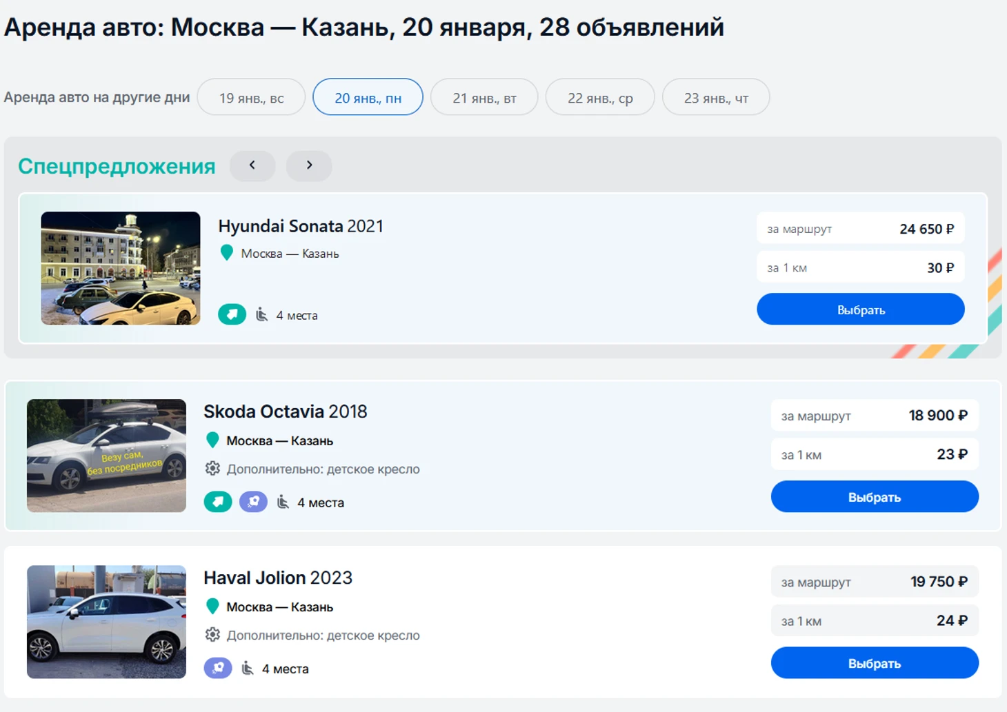 Если вы планируете ехать только с водителем, то на сайте надо выбрать «Аренда и трансфер», указать город отправления и прибытия, выбрать дату поездки. Стоимость проезда 18 000 – 25 000 рублей в зависимости от класса авто. Это дороже, чем билет на самолет и на поезде.