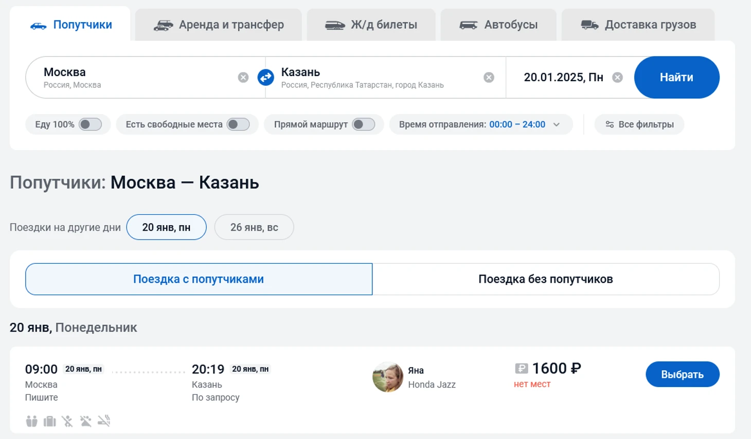 Найти такси через агрегаторы из Москвы в Казань проблематично, так как надо заранее связываться с оператором и бронировать авто. Не все сервисы такси предлагают подобные услуги. Если вы хотите поехать в Казань на машине, но нет личного транспорта, то можно использовать сервисы по поиску попутчиков, например, «Едем.РФ». За 1600 рублей можно найти свободное место в авто, в котором есть уже другие пассажиры.