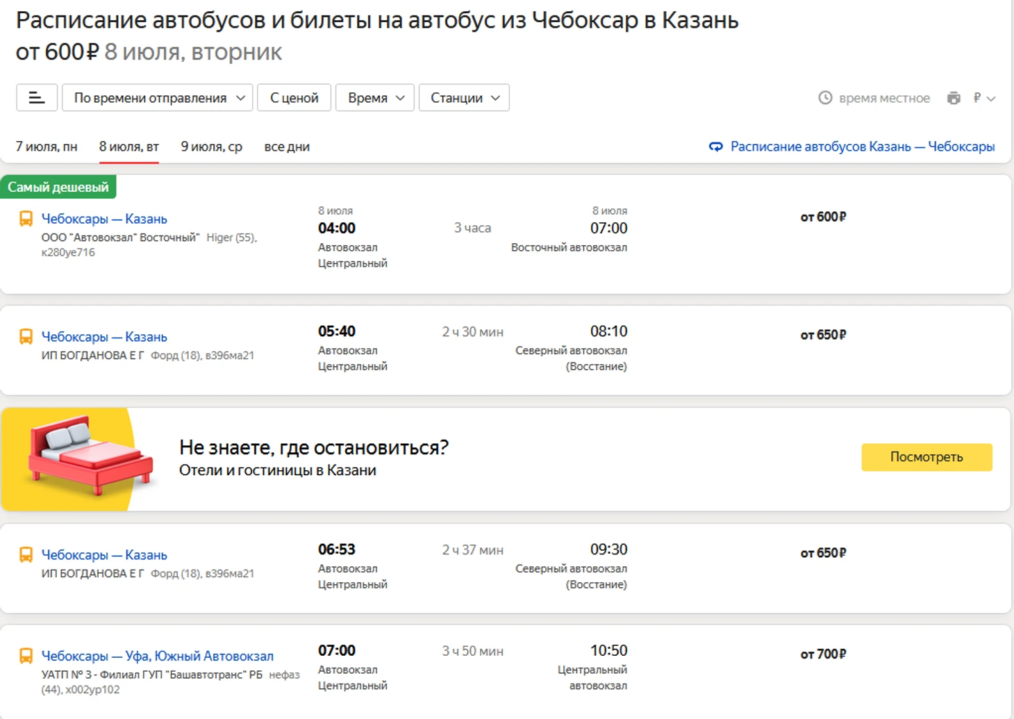 В Казань из Чебоксар можно попасть на автобусе. Стоимость проезда от 600 рублей, время в пути от 2 часов 20 минут. Первый автобус уходит в 05:40, последний в 18:58.