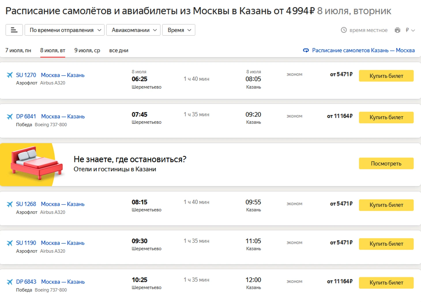 На 8 июля самый дешевый билет стоит 4994 рубля, а самый дорогой обойдется в 11164. Это цена одного билета в эконом-класс без учета провоза багажа. Итоговую стоимость можно узнать на сайте авиакомпаний или при бронировании билета. Время в полете составляет 1 час 35 минут.