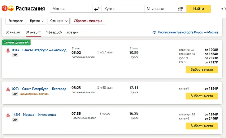 А самый дешевый вариант – поехать на поезде 081А Санкт-Петербург – Белгород и там купить билет в районе 1100 рублей (сидячее место). На этом же поезде есть места в плацкарте, купе и СВ – они будут пропорционально дороже и их стоимость можно посмотреть, например, на сервисе «Яндекс-расписания».