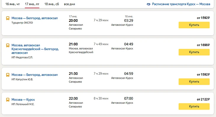На автобусе из Москвы в Курск можно добраться в среднем за 7-8 часов. Количество рейсов зависит от конкретной даты, это может быть 2, 3 или 4 рейса. На примере расписания на 17 января 2025 года (картинка ниже) три из них отправляются с Автовокзала Саларьево и один от Красногвардейского. При этом все рейсы вечерние, начиная с 20:00 и заканчивая 22:30.