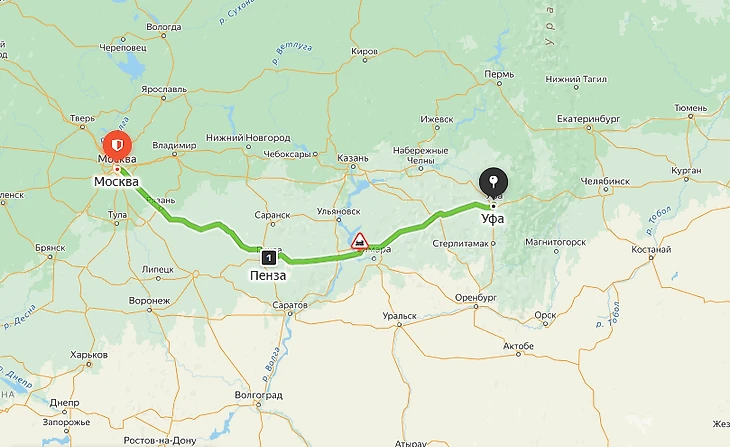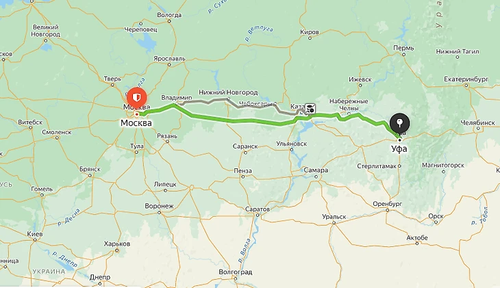 Расстояние от Москвы до Уфы на машине в таком случае составляет 1330 км.