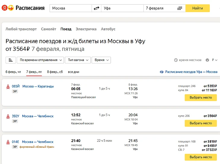 Через день с Казанского вокзала следует маршрут 050Й Москва – Уфа, который отправляется в 15:25 мск и прибывает в 22:09 по местному времени. Там можно купить билеты на плацкарт в районе 3800 рублей, на купе около 4400.