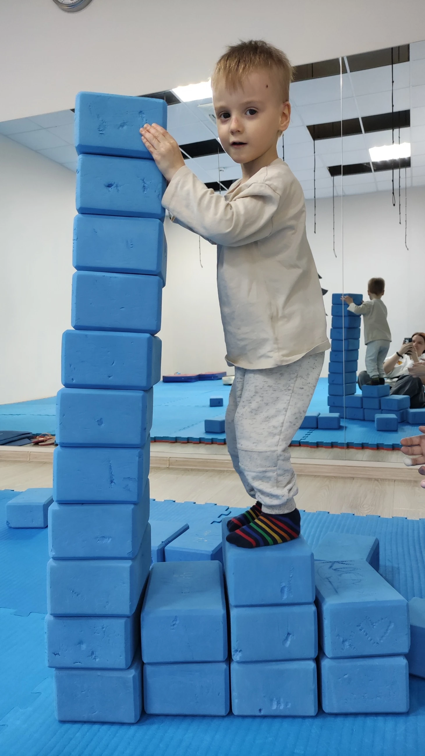 Понятное дело, что у детей по-разному, они подсмеиваются, но изначальная тактика, идея — это все-таки работать с любым уровнем ученика, тут мы делимся своими знаниями. И с Марком действительно щедро очень поделились, потому что он именно телом воспринял очень многое. Это то, что дается именно маленьким детям. И когда он летел с велосипеда, беговела, просто кувырком через руль вверх на асфальт, и люди это видели, конечно, у них был шок. Да, он встал, да, у него текла из носа кровь, да, он там разбил что-то, но он был абсолютно цел. Это то, за что я благодарна безмерно.