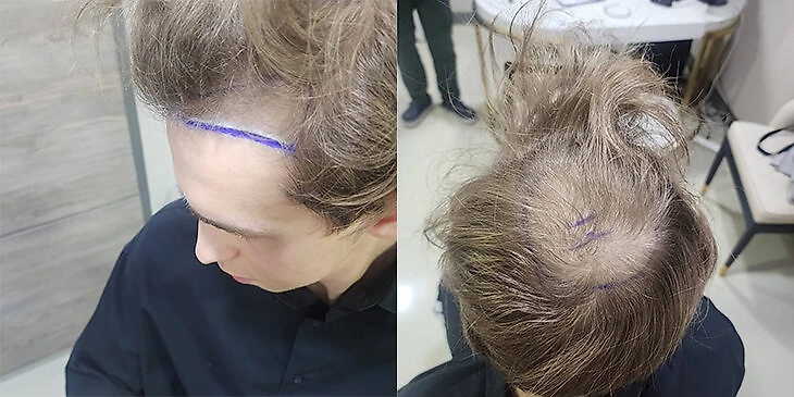 «Утром у меня взяли анализы. Пока я ждал результаты, меня пригласили к врачу, который должен был делать операцию. Врач осмотрел голову и маркером выделил зону, в которой не хватает густоты. Затем он провел желаемую линию роста волос и согласовал со мной количество фолликулов, которые будут пересаживаться», – рассказывает Степан.