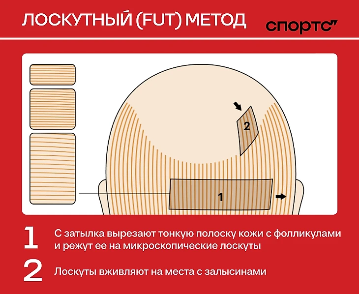 Есть два метода пересадки: FUT (лоскутный метод) и FUE (бесшовный метод). При FUT-пересадке у пациента под местной анестезией вырезают полоску кожи с волосяными фолликулами и нарезают ее на маленькие лоскуты, которые вживляют туда, где волос не хватает. После операции в местах, откуда вырезали полоски кожи, остаются небольшие рубцы.