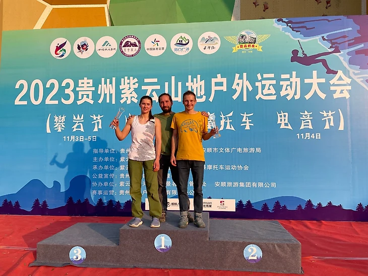 Фестиваль собрал кучу участников. Все проходило в смешанном формате: часть соревнований — на большом скалодроме (классические трудность, боулдеринг (квалификация+финал), затерянном в нашей китайской деревне, часть — на естественном рельефе (фестиваль 20 трасс), в одном из легкодоступных секторов. Мы решили успеть полазать все!