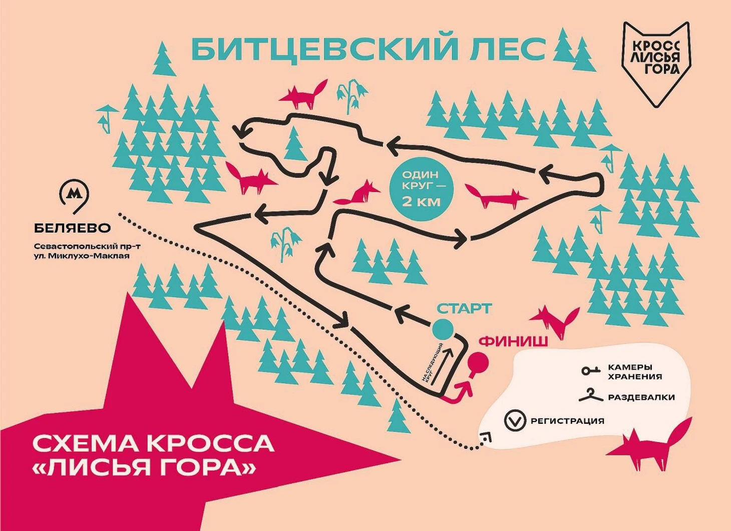 Маршрут кросса проложен в Битцевскому лесу в один круг протяженностью 2 км. Кросс – это бег по пересеченной местности, поэтому покрытие на «Лисьей горе» полностью грунтовое. Трасса может быть сухой, а может, напротив, быть грязной, с лужами – в зависимости от погоды. Также она отличается рельефом: есть спуски, а также подъем на финише каждого круга.