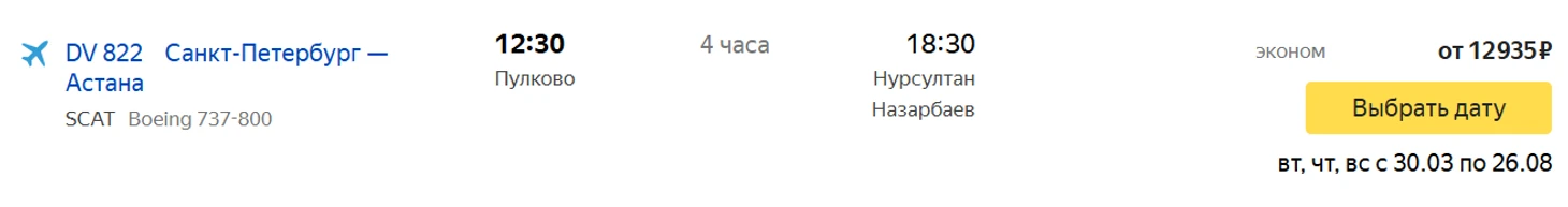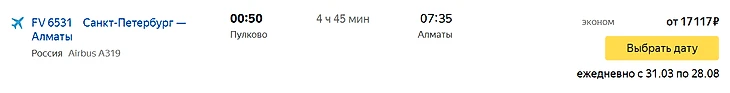 В Алматы из Северной столицы можно улететь ежедневно рейсом FV6531, стоимость билета от 17 717 рублей, время в пути четыре часа 45 минут. С 15 апреля добавится еще один рейс FV6533, следите за расписанием.