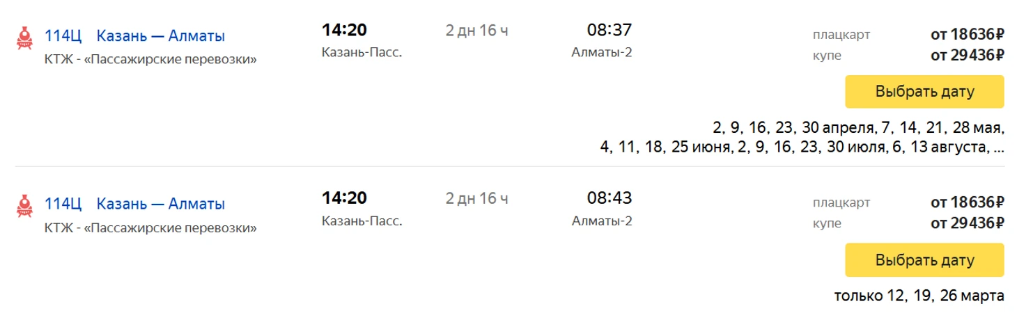 Второе популярное направление – Алматы. Но из Москвы до нее на поезде можно добраться только с пересадкой в Казани. Каждый день в столицу Татарстана отправляется около полутора десятков поездов. Стоимость билетов в плацкартный вагон начинается от 2 121 рубля, в купе от 2 454 рубля. Время в пути составляет от 11 до 13 часов.
