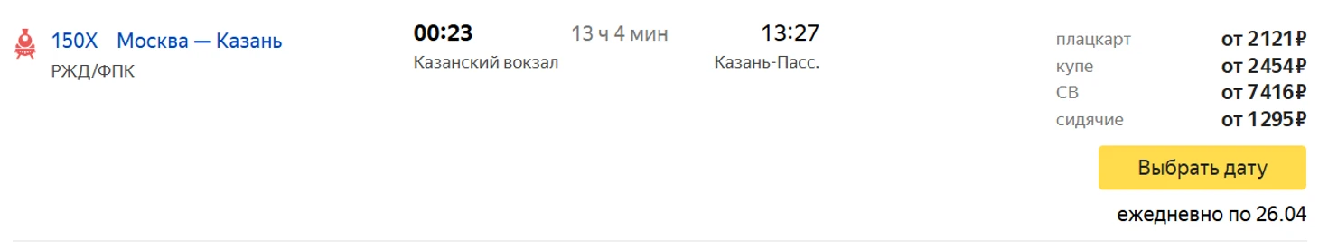 Наиболее удобным будет сообщение 150Х. В пути придется провести 13 часов и четыре минуты, но зато не нужно будет ждать поезд 114Ц сообщением Казань – Алматы. Из столицы Татарстана он отправляется в 14:10, на пересадку уйдет всего полчаса.