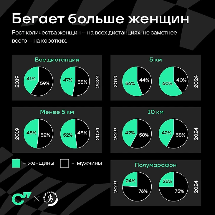 Зато на более коротких дистанциях (особенно 3 и 5 км) женщин становится больше. Если взять все дистанции, то в 2019 году участвовал 41% женщин и 59% мужчин, в 2024-м – 47% женщин и 53% мужчин.