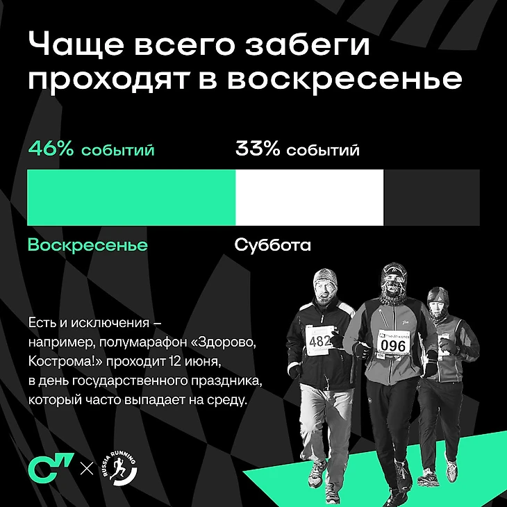 46% забегов проходят в воскресенье, всего 33% – в субботу.