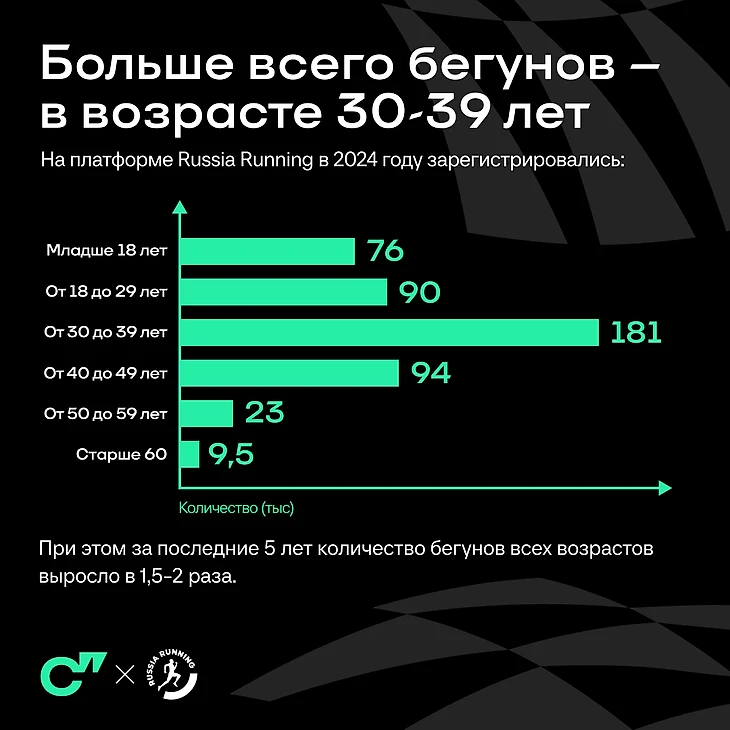 Бегуны 30-39 лет – самые активные по регистрациям на старты. В 2024 году спортсмены этого возраста совершили 181 тысячу регистраций. За ними бегуны 40-49 лет – 94 тысячи, потом возраст 18-29 лет – 90 тысяч. Не отстают спортсмены более старшего возраста – 50-59 – 23 тысячи регистраций, 60-69 лет – 7,5 тысяч регистраций, старше 70 лет – 2 тысячи.