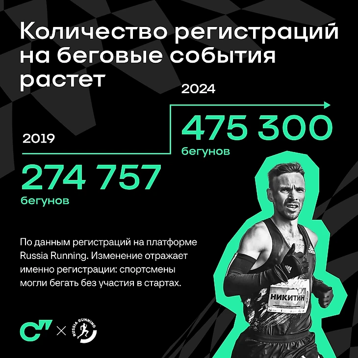 В 2024 году на платформе Russia Running (категория «бег», страна Россия) произведено 475 299 регистраций – 47% от всего рынка. Спортсмены зарегистрировались на 1082 события на платформе.