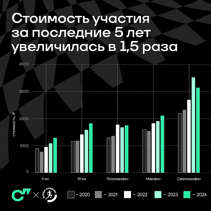 При этом участие в забегах дорожает. В среднем участие в забегах на дистанции 5 км в 2020-м стоило 890 рублей, в 2024-м – 1290 рублей. Дистанция 10 км за 5 лет подорожала с 1165 до 1815 рублей, полумарафон – с 1290 до 1750 рублей, марафон с 1601 до 2110 рублей.