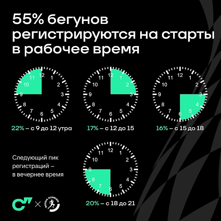 Большинство регистраций приходится на рабочие часы. 22% бегунов регистрируются с 9 до 12 утра, 17% – c 12 до 15, 16% – c 15 до 18. Следующий пик регистраций – в вечернее время, 20% бегунов покупают слоты с 18 до 21.