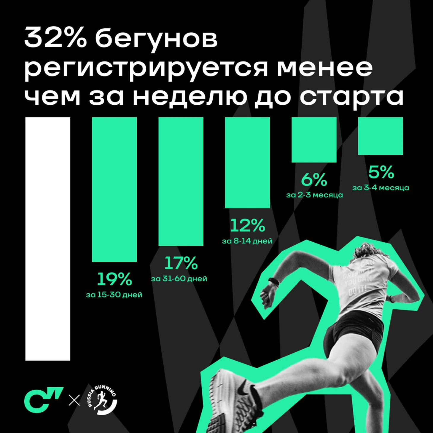 Платформа Russia Running объединяет события разного уровня, на многие из которых можно зарегистрироваться почти вплотную к дате старта. Если возможность есть, то 32% бегунов регистрируется менее чем за неделю.