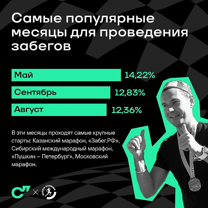 Поэтому все цифры, которые мы приводим ниже, основаны на данных регистраций и результатов соревнований платформы Russia Running и итоговых протоколов, размещенных на сайте «Пробег».