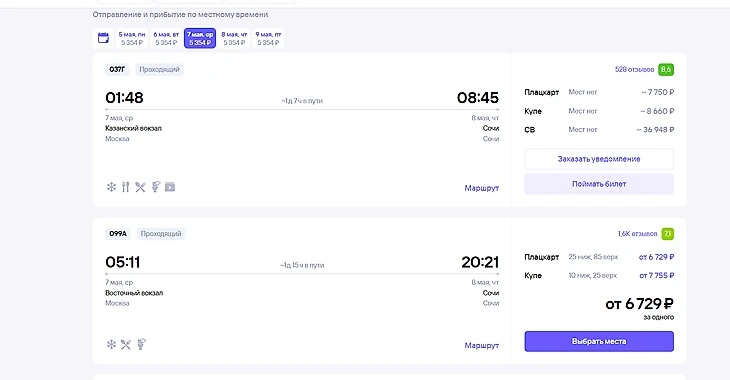 • Выбирайте плацкарт — это самый доступный вариант. Купить дешевый билет на поезд из Сочи в Москву можно от 3 800 рублей, особенно при раннем бронировании.