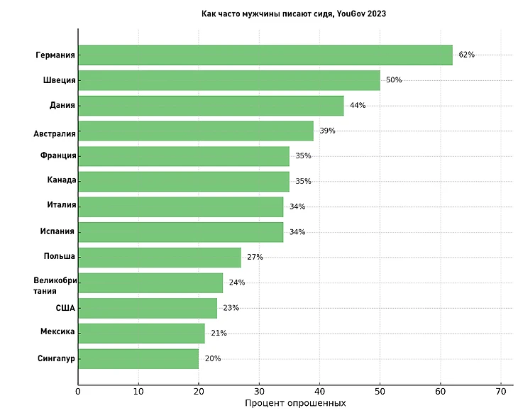 Вот что показал опрос YouGov 2023 года. Мужчин, которые предпочитают писать сидя, больше всего в Германии – так делает почти каждый второй. В Мексике и Сингапуре сидеть при мочеиспускании выбирают немногие. В Австралии и Швеции таких 25% и 22% соответственно, в Канаде – 35%.
