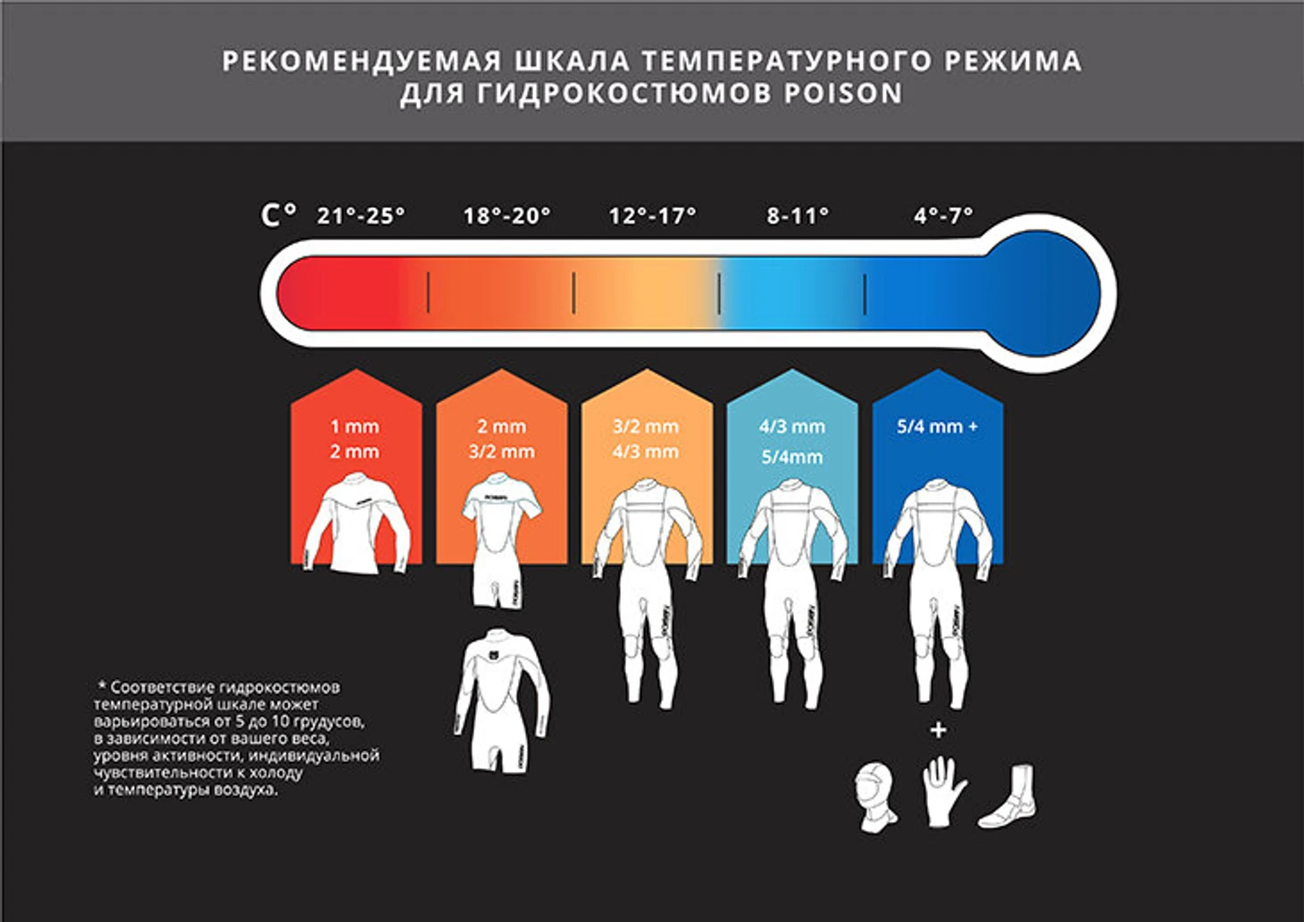 Еще одна важная часть экипировки – гидрокостюм. Серферы катаются в одних шортах только в идеальных условиях. Например, на Бали, где средняя температура моря – 26 °C. В России таких условий нет. Если хотите чувствовать себя комфортно во время серфинга, то для воды холоднее 21 °C поверх плавок или купальника нужно надеть гидрокостюм. Чем ниже температура, тем толще материал – его значения варьируются от 1 до 9 мм.