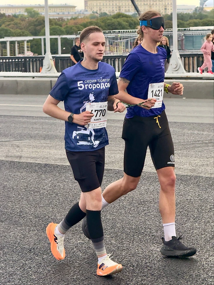 Эксперимент «Марафон в темноте» прошел в рамках Мосмарафона в минувшие выходные. Триатлет Антон Ионов бежал в качестве «незрячего бегуна», с повязкой на глазах. В качестве его волонтера-лидера выступал бегун, футболист Камиль Хасанов. Организатор челленджа — благотворительный фонд «Спорт для Жизни», уже 12 лет помогающий людям с инвалидностью заниматься спортом.
