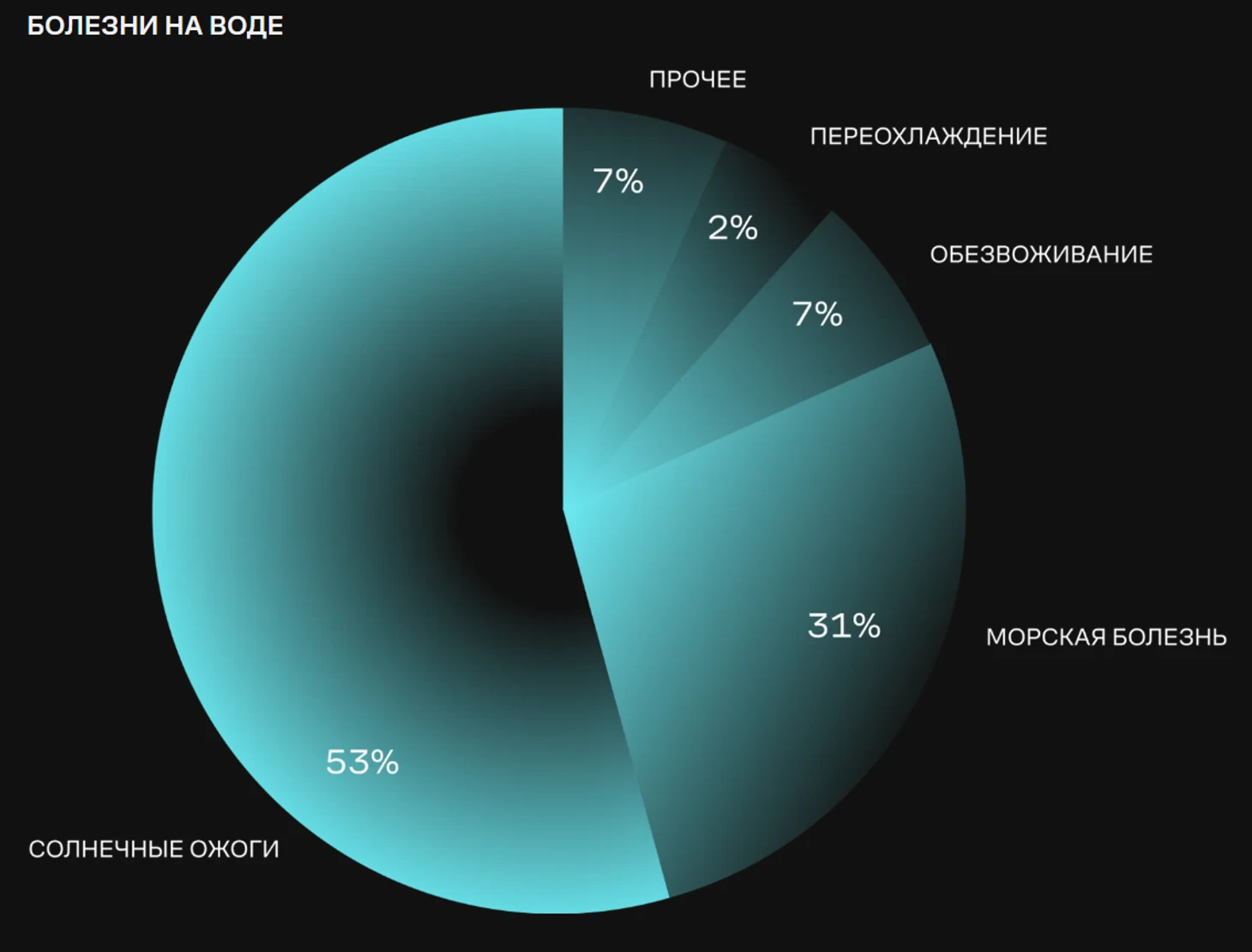 Даже многолетний опыт хождения на лодке не защищает от случайных травм — что уж говорить о тех, кто только учится яхтингу и привыкает к динамике судна на воде. Гематомы, порезы и растяжения — самые распространенные травмы, которые получают те, кто ходит под парусом (около 83% от общего числа).