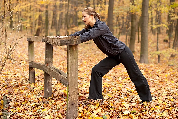 Комплекс упражнений на укрепление ног включает в себя приседания, выпады, зашагивания на коробку/стул/скамью, ягодичный мостик, аналогичные упражнения на укрепление мышц ног.