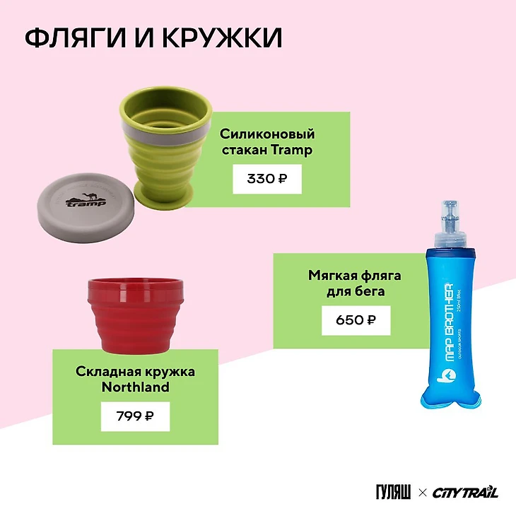 Фляги с водой, многоразовый стаканчик. На длинных или коротких, но сложных дистанциях пункты питания могут встречаться не так часто. Поэтому организаторы рекомендуют брать с собой 1-2 небольших бутылки с водой. Часто фляги идут в комплекте с рюкзаком/поясной сумкой, а иногда в комплекте есть целая питьевая система (гидратор). На тех пунктах питания, что будут на забеге, как правило, нет столов с наполненными одноразовыми стаканчиками: воду разливают из больших бутылок. На такие гонки стоит взять многоразовый стаканчик.