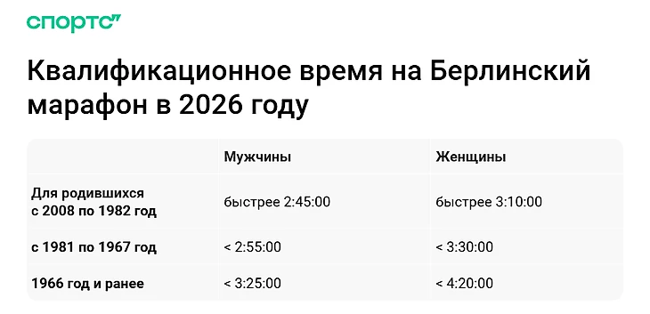 На некоторых забегах для квалификации можно прислать результаты полумарафона, но в Берлине организаторы принимают только марафон – и достаточно свежий, который спортсмен пробежал в 2024 или 2025 году. Принимают только ссылки на официальные протоколы, если во время проверки результата организаторы не смогут подтвердить его, то бегун будет проходить по общей лотерее, а не по каналу быстрых бегунов.