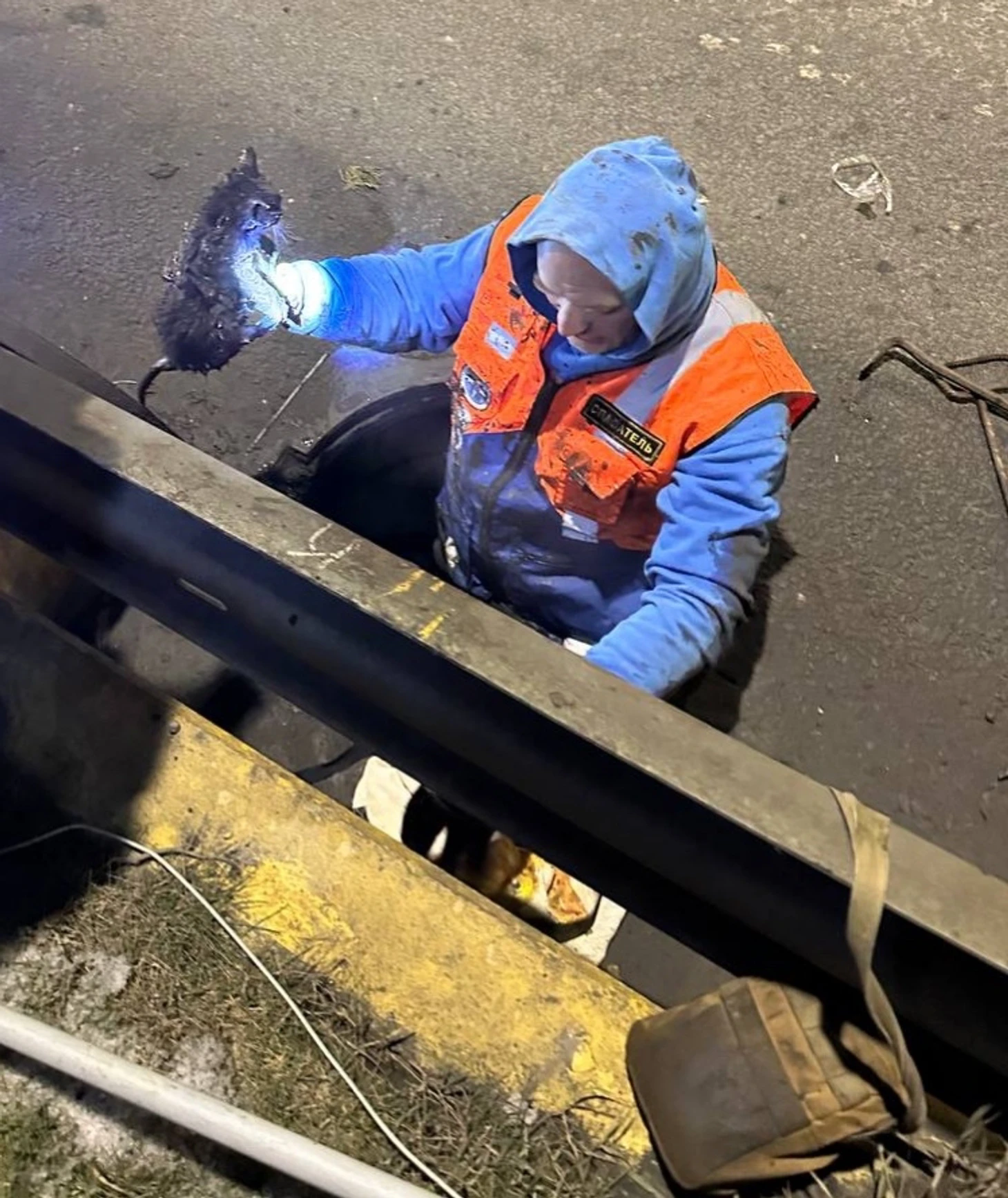 Влада надевает полукомбез ОЗК и спускается в первый люк, я кондуктором и бутылкой пробую выпихнуть котенка к ней. Метра три импровизированный шомпол проходит, но дальше бутылка не проходит из-за наносов. Кондуктор гибкий, и ему легче гнуться, чем пихать препятствие. Провожу кондуктор мимо бутылки и пытаюсь напугать котейку простым шевелением.