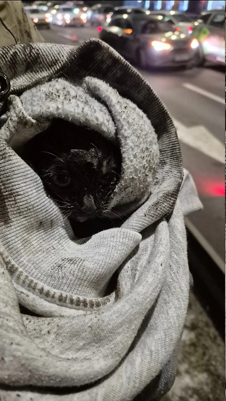 Заявители, которые увидели малыша, припарковались на заправке метрах в 100 от убежища котенка, позвонили в Кошкиспас около восьми вечера и остались ждать приезда спасателей.