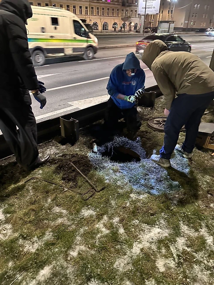 Мы с Владой приехали минут через сорок после звонка, прорвавшись через вечерние пробки. Заявители уже выставили около отверстия знак аварийной остановки и даже нашли люк, в который уходит труба, где сидит малыш.