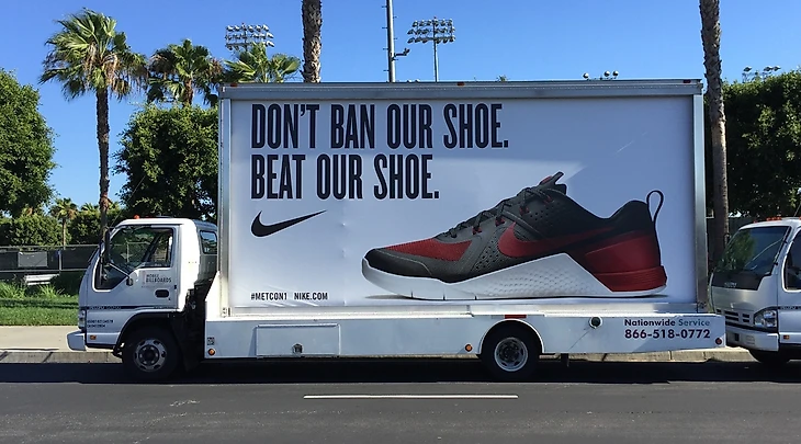 Вернемся к Reebok. Перед CrossFit Games 2015 документально был утвержден запрет на ношение продукции любого бренда на Играх, кроме Reebok. По этой причине перед началом соревнований прямо напротив стадиона, где они проводились, появилось несколько передвижных билбордов от Nike с изображением новых Metcon'ов и надписью "Не запрещайте наши кроссовки. Побейте наши кроссовки".
