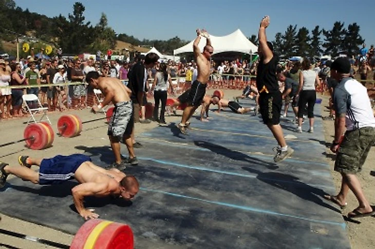 Пять раундов из пяти становых тяг и 10 бурпи. Вес на становой равнялся 125 кг у мужчин и 83 кг у женщин.